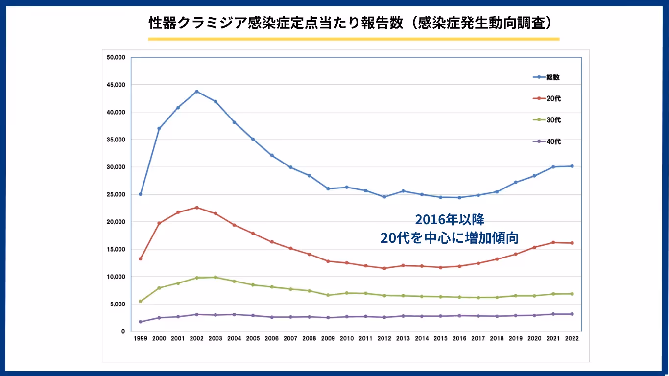 患者数の推移については、2000年代初めをピークに減少して2007年以降は横ばい傾向でしたが、2016年以降に増加傾向に転じています。年代別に見ると、20代での増加が顕著です。